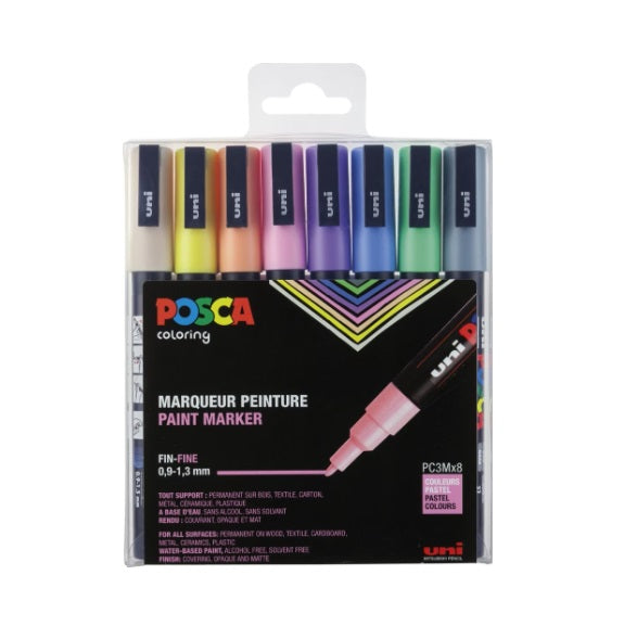 Posca PC-3M Markerset, 1,30 mm, (8 Stück) – Pastell MischfarbenVerleihe jedem Untergrund sanfte Eleganz mit den Pastell-PC-3M-Markern. Die feine Spitze sorgt für Präzision und einen gleichmäßigen Farbfluss.